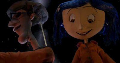 Una noche, ella observa, siguiendo el rastro de unos ratones, como detras de una pequeña puerta, en la que había anteriormente una tapia, se abre un nuevo camino hacia una nueva casa. Un lugar donde están sus padres, mas amables, cariñosos y atentos que nunca, salvo con la excepción de que éstos tienen botones en vez de ojos.