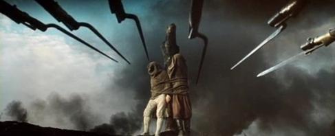Además, el director se adorna con una puesta en escena pictórica y fiel a la mejor tradición del cine soviético. Aquí, nos acordamos de otros cineastas. En concreto de Eisenstein y su obsesión por la verticalidad (véase la excelente Iván el Terrible). Bondarchuk sigue al maestro cuando emplea planos en ligero contrapicado que, sumados a la altura de los actores, a las facciones estilizadas de estos (el perfil griego de Andrei, por ejemplo), y a los elementos del decorado como lanzas o columnas, dan ese tono vertical de tanta belleza plástica.